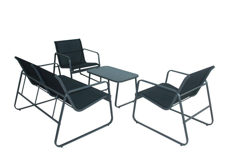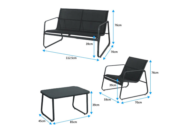 • Box Contents: 2 x sling chairs, 1 × 2 seater sofa, 1 x outdoor coffee table