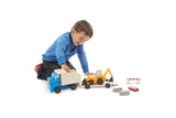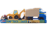Get constructive play rolling with this heavy duty wooden dump truck, flatbed trailer, and front and backhoe loader!