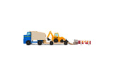 The eight-piece set includes four wooden construction pieces to scoop, haul, and dump, and a wooden road barrier to add to the construction site. The bed of the truck tilts, the trailer can detach from the truck and has a fold-down ramp, and the loader arms and buckets lift and scoop!