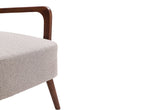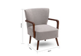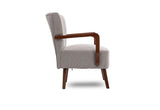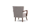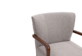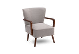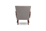 Its soft, light grey fabric provides a cozy seating experience, while the walnut-colored armrests and legs add a touch of elegance and warmth.