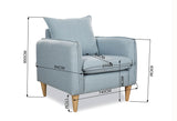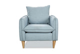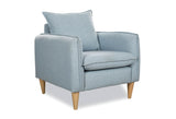 This armchair is fully uphostered in a statement sky blue fabric, contrasting with the stunning wooden legs.