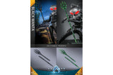 The DC Comics action figure is expertly crafted based on the appearance of Black Manta in the movie. It features a newly crafted metallic silver Black Manta helmet with a red LED light-up function, also interchangeable battle-damaged eyes. His iconic suit is skillfully tailored through specialized material to enhance articulation range and comes with an LED lighted accelerator backpack which is an essential part of his outfit design. Along with a splittable Trident in black and an additional one in translucent green that mimics the activation of the trident, interchangeable hands, and a themed base for display.