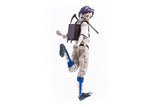 Ebisu has approximately 34 points of articulation, and she comes with two interchangeable heads – an originally designed masked head, and an unmasked head. The unmasked head was sculpted by Masaki Asai! Ebisu’s baseball uniform is non-removable; the shark mascot costume is made of fabric and has Three Zero’s famous weathering paint. The costume is easy to put on and take off, and a bendable metal wire is built in along its spine from the nose to tail for posability. The fins also have magnets built in, so she can hold the included drink while she’s wearing the costume.