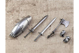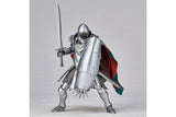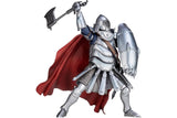 Takeya Shiki carefully designed the armor to recall Western armor styles, while keeping in mind its ceramic composition. He used ideas and concepts from the manga as well as the film, and the result is a dignified, realistic set of armor with metallic paint giving it an appearance of weight. By connecting the joints of the multi-layered armor into folds, a high degree of posability has also been achieved. He’s armed with his sword, battle axe and shield; the shield features the pop-out claw that was seen in the manga! Other details seen in the manga but not the film, such as the shape and details of the axe and sword grips, are also present.