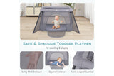 Transform your’s world in minutes with our ultimate 2-in-1 travel crib!Seamlessly transitioning from a cozy crib to an exciting playpen, this innovative product requires no tools for setup. The see-through mesh enables you to observe your little ones as they enjoy their new space. The crib features a portable design that is convenient and easy to transport to various locations due to its compact folding mechanism. It also includes a carry bag for added convenience. Moreover, premium comfort and security are guaranteed with a soft-padded mat, wrapped guardrail, and protective mesh. Additionally, the sturdy frame and easy-to-clean cover allow you to focus on fun, not on fuss. Provide your with the best!
