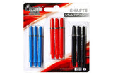 Includes 3 sets of ring grip nylon shafts (9 shafts total) that are 48mm in length each. The small metal ring springs that come with these shafts are used to tightly secure the flight inside the shaft. The ring spring squeezes the four prongs on the end of the shaft together, assisting to hold the flight in place.