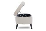 Upholstered in beige fabric, the contrast black metal legs offer a modern edge, while the gas lift mechanism reveals hidden storage—perfect for keeping your space tidy.