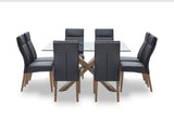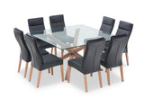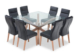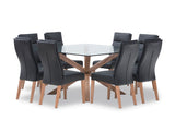 Comprising of a Promenade Square Glass Dining Table with a tempered glass top and pewter-coloured timber legs and eight luxurious Asheville Dining Chairs in a black upholstered covering with padded seat back designs that exude style and quality. The Promenade 9 Piece Dining Suite with Asheville Dining Chairs arrives ready to assemble and comes with a 5 year guarantee.