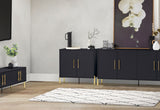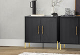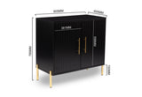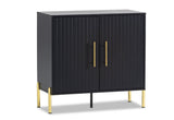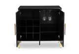 Combine dining and entertainment with the Delgado Wine Cabinet. This contemporary modern design is perfect for anyone looking to add a memorable piece to their living and dining space, while keeping it simple. The beautiful contrast between the black colouring and the gold door handles and legs is striking, and the stylish look is elevated with the fluted panelling detail on the door fronts. The cabinet includes a wine rack to hold nine bottles and a metal wine glass rack.