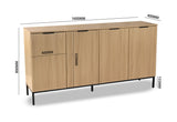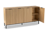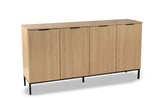 Featuring four doors with beautiful fluted panel details, it combines both elegance and practicality. The contrast black metal handles and legs add a modern touch to the natural timber-look finish. Ideal for use as a storage solution in your dining area, it offers ample space for storing dinnerware, serving dishes, linens, or beverages.