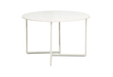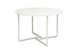 The Deleon Round Dining Table features a sleek, modern design with a white metal frame that adds a fresh, airy touch to any dining space.