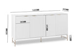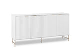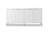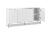 Elevate your living space with the Osborne 4 Door Buffet. This sleek buffet has a fluted panelling design and a timber-look construction, providing a modern contemporary look and feel to any living area. The champagne gold metal handles contrast beautifully against the white finish, and the matching gold metal legs help ensure sturdiness. The piece has an overall weight limit of 130kg and each cupboard has a weight limit of 30kg.