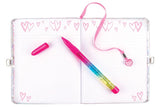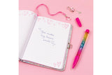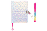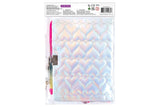 This Iridescent silver, quilted, locking, journal with rainbow, glitter pen will set any tween’s heart aflutter! The 192 page lined journal has pink and white pages with a ribbon to help keep your place. Journal features a gem, lock which comes with 2 keys. The pen with rainbow floating glitter completes the set and make it easy to jot down your inspiration of the day!