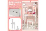 This lovely snowflake vanity set with mirror and stool is a perfect gift for your little ones! The vanity table comes with a tri-folding mirror, which is able to show little ones their faces clearly from all angles when sitting in front of the table. Besides, after removing the top part, the dressing table can also be used as a writing desk. The large drawer can store little ones’ makeup, jewelry or other supplies, creating a neat area for little ones to make up or study. Moreover, the whole vanity set adopts round corner design to prevent little ones from accidental injury. Made of premium MDF and supported by curved legs, this makeup table and stool set ensures great sturdiness and a long service life. The bottom anti-slip foot pads protect the floor from scratches while the back anti-toppling device helps to fix the desk to the wall to prevent tipping over or wobbling. With the cute appearance and perfect size, this snowflake vanity set will be a great addition to your little ones’s room or play room.