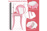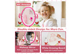 The mirror of the vanity table is made of safe and durable acrylic. And it allows for a 360-degree rotation. The front side is a makeup mirror, the back side is a whiteboard for drawing and writing. Plus, the dressing table set also comes with 4 colorful markers. The tabletop features 2 small storage grids, perfect for keeping your child’s accessories organized. Besides, there is a drawer underneath the table for additional storage space. Safety is a top priority, which is why the table is equipped with an anti-tilt device at the back. And the table and stool legs are both equipped with non-slip foot pads to enhance stability.