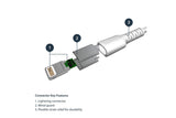 Flexible Strain Relief: The cable is constructed to prevent the connector from separating from the jacket. The extra-long strain relief molding is tested to withstand over 10,000+ bend cycles at a 180° angle. Plus, the improved inner molding resists cracking and reduces cable damage.