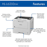 The Brother HL-L6210DW business monochrome laser printer is a great choice for busy offices and workgroups with higher print volumes that need fast, high-quality output, low-cost printing, large paper capacity, and advanced security features. This high-performance printer helps to increase productivity with a fast print speed of up to 50ppm?. Delivers low-cost printing by using the TN920UXXL Brother Genuine ultra high-yield replacement toner cartridge. Triple Layer Security features help to limit document and device access and protect against network intrusions. Offers a large, expandable paper capacity that is scalable as your business needs grow. The HL-L6210DW also provides flexible connectivity with built-in Gigabit Ethernet and dual band wireless networking, plus convenient mobile device printing to meet mobile workforce demands?.