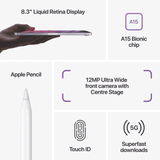 All-screen design with Liquid Retina display. Powerful A15 Bionic chip. Superfast 5G(1). Now in four beautiful colours. Go from inspiration to creation - any-time, anywhere. Gorgeous all-screen design with an 8.3-inch Liquid Retina display that fits in the palm of your hand(2). And Apple Pencil now attaches magnetically to the side, ready for all those spur-of-the-moment moments(3). Faster performance. The new A15 Bionic chip and all-day battery life let you work, create and play wherever life takes you(4). Edit photos and videos, play graphics-intensive games and experience unreal AR. Stay connected with superfast 5G, Wi-Fi 6 and USB-C. So you can make FaceTime calls, stream, play and collaborate from just about anywhere(5). Enjoy more natural video calls with the 12MP Ultra-Wide front camera and Centre Stage. Shoot vivid photos, record 4K video or scan a document with the 12MP Wide back camera. iPad mini now supports the second-generation Apple Pencil, which attaches magnetically and charges wirelessly. And a colourful Smart Folio protects iPad mini and folds into a stand(3). iPadOS is powerful and easy to use straight out of the box. And with over a million apps on the App Store designed just for iPad, youll find the right app for anything you want to do(6). DISCLAIMERS: (1) Data plan required. 5G and 4G LTE are available in selected markets and through selected carriers. Speeds are based on theoretical throughput and vary based on site conditions and carrier. For details on 5G and LTE support, contact your carrier and see apple.com/au/ipad/cellular/networks. (2) The displays have rounded corners. When measured diagonally as a rectangle, the iPad Pro 12.9-inch screen is 12.9 inches, the iPad Pro 11-inch screen is 11 inches, the iPad Air (4th generation) screen is 10.86 inches and the iPad mini (6th generation) screen is 8.3 inches. Actual viewable area is less. (3) Accessories sold separately. (4) Battery life varies by use and configuration; see apple.com/au/batteries for more information. (5) FaceTime calling requires a FaceTime-enabled device for the caller and recipient, and a Wi-Fi connection. Availability over a mobile network depends on carrier policies; data charges may apply. (6) Apps are available on the App Store. Title availability is subject to change.