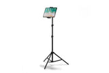 A foldable, lightweight, easy-to-use height-adjustable tripod with integrated tablet/phone holder for viewing your device at a tailored display height, suitable for tablet display, streaming/recording, music note stand, etc.
