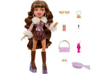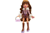 Cloe, Yasmin, Jade, and Sasha continue to explore their personal styles and unique looks in these all-new dolls. Yasmin wears a chic lace-up look with a pinstripe, faux fur trimmed long sleeve top over a paisley print halter, textured pleated mini skirt, and dramatic boots with a metallic platform. Yasmin accessorizes with gold dangling flower earrings, a gold choker, and violet purse. She also comes with extra accessories like sunglasses, makeup, a phone, smoothie, and hairbrush!