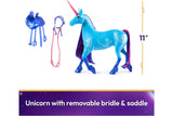 Inspired by the NETFLIX animated show and best-selling book series where friendship reins, this 11-inch River unicorn toy brings the gentle, shy creature to life. Beautifully detailed, River features pearlescent Water Magic markings on his side, majestic glittery horn, colorful mane and tail, and removable bridle and saddle doll accessories for added play. Gently move River’s head to bring out his personality and relive the magical bonding experience between unicorn and rider with Isabel. Brush River’s soft mane and tail with Isabel’s styling tool (not included, sold separately with doll) and ride into adventure to protect Unicorn Island and its magic!
