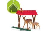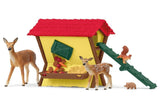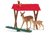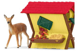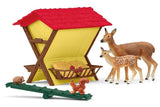 What can the Red Deer doe and her sweet calf find in the feeding trough? While they are enjoying their lunch, the squirrel and hedgehog have also stopped by for a snack. Because of the removable roof, you can see immediately whether there is still enough food and hay in there for all of them. To make sure that even the smallest animals can get to the food, there is even a ramp!