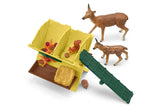 There’s something for everyone: the Red Deer Doe and her calf are happy about the food pellets, but they both also enjoy crunchy carrots. The shy hedgehog also likes to come by. The squirrel slips curiously through the feed hatch into the manger. Maybe it will find a nut? In any case, it has found a cozy hiding place under the roof. Up there, it can also see the forest farmer coming along in his car (playset sold separately).