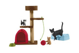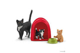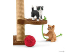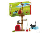 In “Playtime for cute cats” from the Schleich® Farm World the cute cats play with the ball of wool, frolic around their scratching post or hide in their little house. After all that playing they have a rest in their bed. The scratching post can be adjusted and the house can be placed as desired. The set contains three cute cats and accessories.
