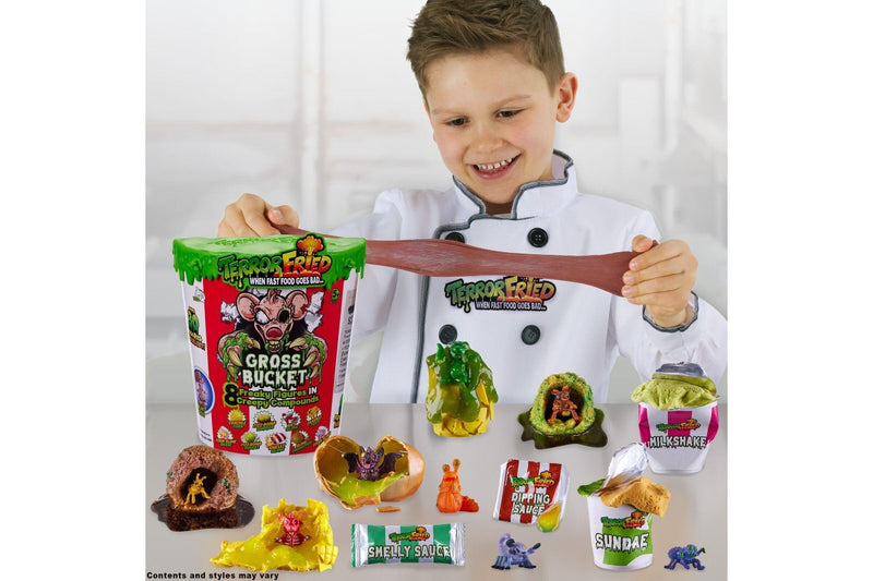 The nugget and burger ‘fry’ in water to reveal a freaky figure. Smash open the crackle fries, corn and chicken leg, and then squish the foul flurry and mouldy milkshake to find each character – the Gross Bucket has 9 compounds with 8 creepy collectible figures inside! Find and collect over 30 Terror Fried figures (each sold separately), including rare neon and super-rare metallic figures! Includes collector’s sheet to track your Terror Fried creature collection.