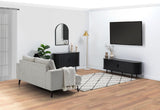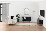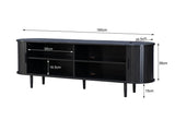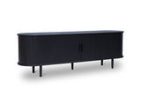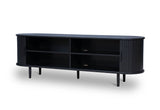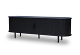 Immerse your living space in modern sophistication with the Tanner Entertainment Unit. Featuring a contemporary design marked by rounded edges and a captivating ribbed pattern, this unit harmoniously combines a sleek black timber-look finish with sturdy metal legs. With two doors that open to reveal generous storage, this entertainment unit seamlessly fuses style with functionality. Measuring at 530H x 1600W x 395D, it's the perfect addition to your home. Exclusively available online, the Tanner Entertainment Unit is the ideal choice for those who value both aesthetics and practicality in their interior decor.