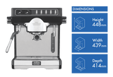The dual heating system allows you to prepare coffee and milk at the same time, while the 58mm commercial size group head pulls rich, full-bodied espresso shots. With a 12.8kg weight and dimensions of 448mm height, 414mm depth and 439mm width, this espresso machine looks great on any kitchen benchtop.