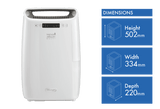 The intuitive electronic controls let you set your ideal humidity level from 30% to 80% RH, while the 24-hour timer allows you to run it day or night. With its sleek modern profile and integrated carry handle, the DeLonghi Aria Dry Multi can move room to room or be tucked away out of sight. Stay comfortable through changing seasons and weather with the power to extract up to 16 litres of water per day.