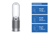 The Dyson HP07 Hot+Cool Purifying Fan (368801-01) in White/Silver captures dust and allergens, removing up to 99.95% of particles as small as 0.1 microns(1). Automatically detects, airborne particles and gases, then diagnoses and reports them in real time. Air Multiplier technology generates the circulation power to purify the whole room(2). Sealed airflow and filtration system. So our whole machine, not just the filter, meets HEPA H13 (3) standard. What goes inside, stays inside.