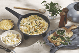 The skillet's large cooking surface and high walls make it perfect for cooking family-sized portions of pancakes, eggs, meats and more. With cool touch handles and a tempered glass lid, operation and monitoring is safe and simple. The wipe clean interior also makes clean up a breeze.
