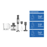 The additional accessories including a 0.5L chopper, metal whisk, and easy pour beaker help you tackle a wide range of recipes. And at 320mm high, 530mm wide, and 120mm deep while weighing just 1.78kg, storage is a breeze. Backed by a 2 year manufacturer's warranty, the Kenwood Triblade XL Plus Hand Blender brings power and versatility to your countertop. The manufacturer's part number for this product is HBM60307GY. Discover how this hand blender can streamline meal preparation by getting yours today.