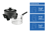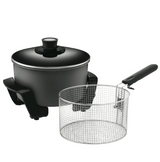 The sleek black design looks great on any countertop, while the 5 litre stainless steel basket provides plenty of room to cook delicious deep fried foods for the whole family. With a 5 litre saucepan and deep fryer in one, this handy appliance does double duty for all your frying and sauce making needs.