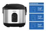 The included steaming tray lets you steam veggies or fish alongside rice for a complete meal. Other highlights include the compact 240mm width to fit snugly on your countertop and durable construction backed by a 1 year warranty.