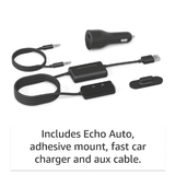 What's In The Box: Amazon Echo Auto (2nd Gen), included accessories and user manuals - Cable wrap, Adhesive car mount, Spare adhesive, Cleaning pad, 3.5mm auxiliary cable, Dual USB fast car charger