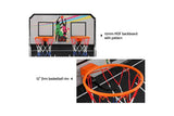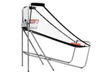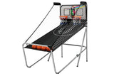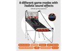 Bring the thrill of the arcade home with your very own Basketball Shooting Machine. The game is made from quality coated steel tubes that are rust-resistant as well as waterproof and stain-resistant printed polyester fabric that is sturdy and durable, so you can use it indoors or outdoors. Comes with 8 different popular game modes to challenge your friends and family to thrilling games of skill. Realistic sound effects make you feel like youre actually at your local arcade hotspot. The LED automatic score counter provides an accurate and impartial referee for two players, no fighting on the courts! The high net catches stray balls and returns them quickly and easily so you can get back to fun. The triangle frame design and anti-slip feet always keep the game stable. With a foldable, portable and easy-to-assemble velcro design, you can play basketball in minutes, whether at home or on the road. Includes a bonus of four basketballs to always keep the fun rolling. Game on to victory with your very own arcade-style Basketball Shooting Machine.