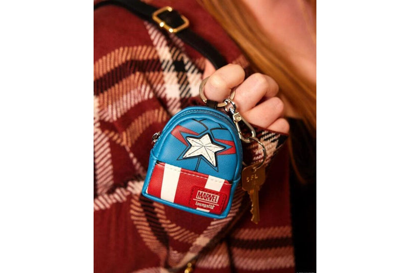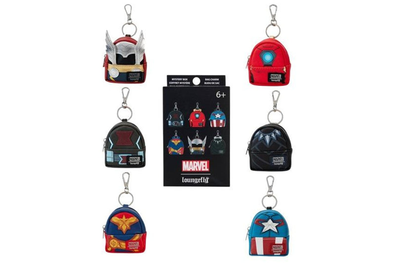 Collect all 6 cosplay mini-backpack key chains – including Iron Man, Captain America, Thor, Black Widow, Black Panther, and Captain Marvel!