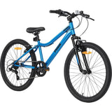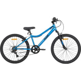 The Pedal Roar 24" is a kid's bike that balances affordability with safety and style. It features a steel frame with a trapeze design for easy access and comfort. The Microshift 7-speed shifters allow for smooth gear changes, while the coil suspension fork ensures a comfortable ride by absorbing bumps. Equipped with rim brakes and alloy levers, it offers reliable stopping power. The 24" all-terrain tires make it suitable for various riding conditions, whether in the park, around the neighborhood, or commuting to school.