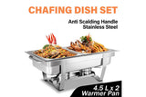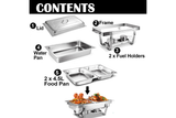 - 2 Pan Bain Marie: This chafing dish set contains 1 foldable frame,2 safety fuel holders,1 water pan,1 cover, and two 4.5L food pans which can can hold different foods at the same time.The chafing dish also has handles to ensure that the product can be moved with ease.