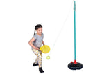 - Contents: 1 top pole with coil and rotating arm, 1 flat bottom cavity base for best stability on hard and soft surfaces, 2 plastic tennis paddles and tennis ball on a string