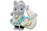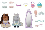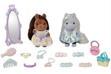 They love to style each other. The hair can be combed, braided or decorated with hair clips and crowns. This creates new trendy hairstyles. In the mirror, you can then admire the finished hairstyles. The Sylvanian Families: Sweet Pony Friends playset includes a standing mirror, a comb, a brush, a crown, hair ties, hair clips, handbags and two pony girls figures with hair for styling.