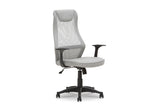 The chair features mesh for increased ventilation and is available in a stylish grey with black armrests.