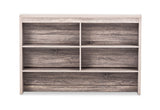 This is a two drawer desk with an open shelf for extra storage and accessibility, and matching hutch with multiple storage spaces overhead.