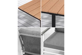 Living life to the fullest. Chilling out under the sun, moon and stars. Alfresco dining with friends, family or just with your precious me-time. Simply pursuing and enjoying life that is meant to be. And the Livsip Outdoor Dining Set is ready to be there at home with you. Stylish. Contemporary. Beautiful. For the dining table, a unique composite wood/plastic top with a natural wood grain finish. And for the dining chairs, equally attractive pieces that go well with the table. The set has all the attributes of chic outdoor furniture that resonate with your discerning lifestyle. Have your lattes, your favourite brews and savour delectable cuisines and other gastronomical delights. Eat, drink and be merry! But how does the dining set stand up to the harsh and sometimes fickle Australian weather? No worries mate as it is all weather-resistant, chairs and table, with strength and durability for robust use. Not least, this dining setup also looks fabulous with any indoor eclectic styling ideas that you may have. Convinced that this delightful outdoor package is for you? Click on the Buy option and soon you will be feasting to your (and many others too) heart is content at the Livsip Outdoor Dining Set day and night, night and day, in every season.