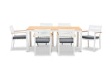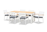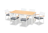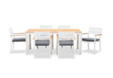 Featuring timber table top, matching arm rest detailing, soft grey fabric cushions and crisp white aluminium frame.