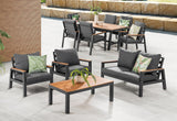 The charcoal aluminium frame is complemented by the timber accents on the table top with ample space to fit up to six chairs.