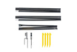 Comes with attached guy ropes, pole stabilisers and plastic sand pegs.